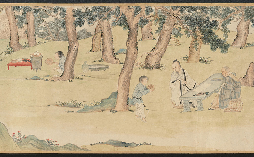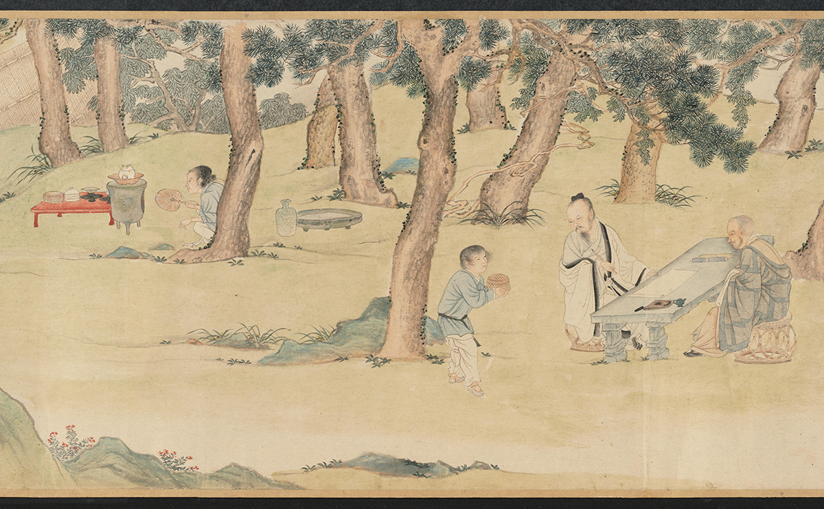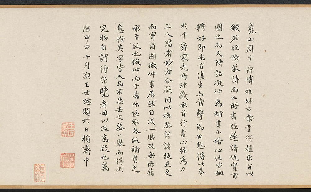 写经换茶这个典故在元代时候就很有名,有很多人在歌咏。但是,传到明代以后,人们只能看到歌咏这个故事的元诗,却早就不见了赵孟頫手抄的经文。据作品后面文徵明之子文彭、文嘉的题识我们可以知道此幅作品是明代收藏家周于舜托仇英依赵孟頫 “写《心经》换茶诗” 的诗意而作,同时并请文徵明在画卷后以小楷书写《心经》以代赵孟頫换茶而作的《心经》。(介绍参考)