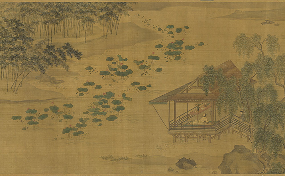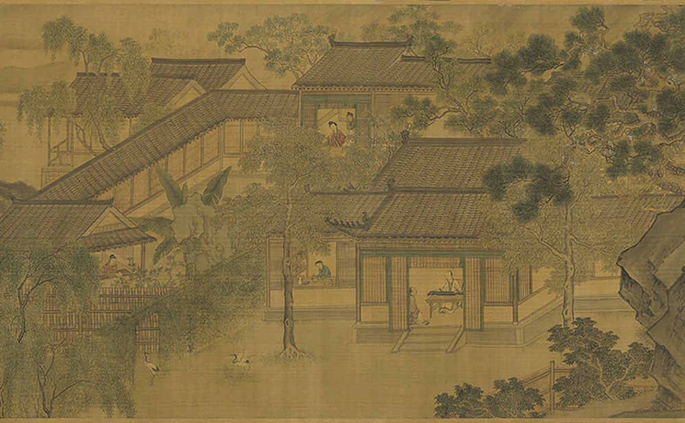 本卷以平远的布局为背景,卷首是两位高士晏坐在山石间,表情轻松愉悦,好像正在随意闲聊。接着视角深入山林,穿过山间的亭子和跨过溪流的小桥,一个宅子的景象映入眼帘。庭院中有两只仙鹤,前厅里有一位文士正在抚琴,客人正微笑着聆听音乐。在宅子的左侧,一个人正坐在窗前读书,窗外几朵花盛开在枝头上,仿佛能闻到阵阵幽香。在宅子的幽深处,一个仕女悠闲地坐在窗前,旁边有一个小仆人。接着在湖边的水榭中,有一个人正倚坐欣赏着湖上连片的荷花。接下来,与宅子中宁静的夏日不同,画家转而描绘农忙的场景。两个农夫在河边踩脚踏水车,他们面前的广阔农田等待灌溉。田边几个渔夫捕鱼归来,手拿鱼篓,肩上扛着渔网。卷尾以宁静的江景作为结束,一行白鹭飞过江面,一位渔人坐在江上的船中吹着笛子,意境悠远。本卷虽描绘细致,但风格相较刘松年风格更为妍秀,气息不类,或为后人托名之作。[1]