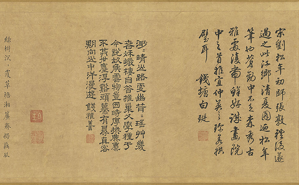 宋劉松年初師張敦禮。後遂過之。此江鄉清夏圖迺松年筆也。蒼勁中不乏森秀。古雅處復帶鮮妍。誠畫院中之首推。宜仲英之珍若拱璧耳。錢塘白珽